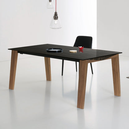 The innovative design features 1 internal swivel extension, allowing for a seamless transformation from a compact piece to a spacious dining area, providing the perfect setting for both intimate gatherings and larger celebrations. Crafted for modern living, the Amon table is not just a piece of furniture; it's a functional work of art. The wooden legs lend a touch of warmth and natural elegance, while the ceramic detail on the upper part of the leg bridge adds a sophisticated aesthetic.