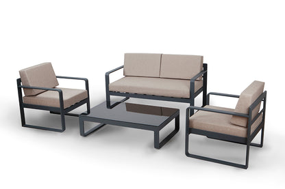 - Aluminium set with two armchairs, one sofa and a table with a glass top, upholstered cushions with acrylic fabric