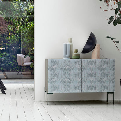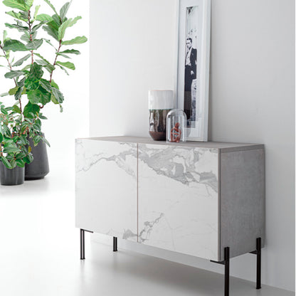 The DAFNE 120 is available with either two or three doors, catering to various storage needs and preferences. It comes in different heights, allowing you to choose the perfect size for your space. The structure of the sideboard is crafted from either excimer lacquered or mortar effect laminate, providing a sleek and durable finish. The feet are available in transparent glass or black metal, adding a touch of elegance and stability to the design. The fronts of the sideboard feature stoneware or glass with digital printed graphics, offering a visually striking appearance that complements any modern living room.
