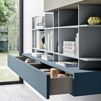The featured Day 18 composition, priced at £3514.90, includes floor-standing base units on a Lama base, a wall unit with drawer, raster bookcase, and a drop-down wall unit. Finished in Oxidised Ash, Indigo, and Nebbia matt lacquer, this unit exudes understated elegance and architectural finesse. Whether used as a dedicated TV wall, storage solution, or display system, the Day 18 exemplifies the Modulo collection’s ability to blend functionality with bold, contemporary design.