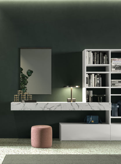 - Finish shown (images): Bookcase in Bianco melamine with Teka glass, Apuano marble melamine back, Piombo lacquer TV stand