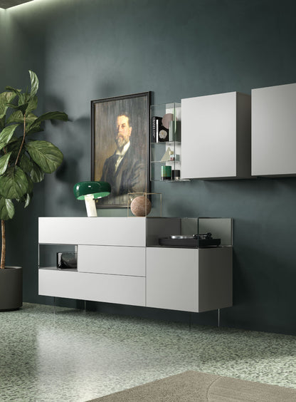 The shoulder bookcase in Bianco melamine is paired with a Teka display case in transparent glass and an Apuano marble melamine back panel, adding refinement. Compongo wall units in Bianco matt lacquer with screen-printed Calacatta Gold glass fronts elevate the design, while the rotating TV stand in Piombo matt lacquer adds functional versatility. Completing the ensemble are the Modulo sideboard in Bianco matt lacquer with a Plexiglass Pero base and complementary Vidro glass wall units, ensuring a harmonious and contemporary living solution.