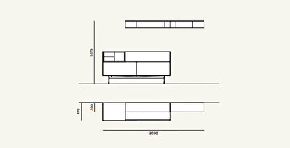 The composition is enhanced by a Modulo sideboard in Basalto matt lacquer with Linea fronts, adding understated luxury. A Strema element in Ottico matt lacquer introduces a contemporary touch, while the Dalia base in burnished metal with Ottico details ensures stability and visual coherence. Completing the design, Air filing cabinets in Arctic matt lacquer provide versatile storage, creating a harmonious balance of form, function, and Italian craftsmanship.