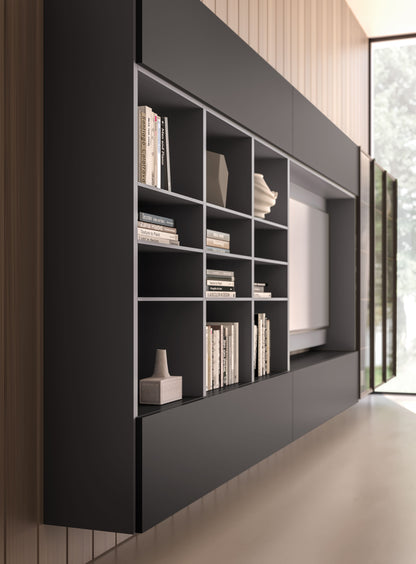 A suspended modular composition with bookcase, TV area, and integrated sideboard. -