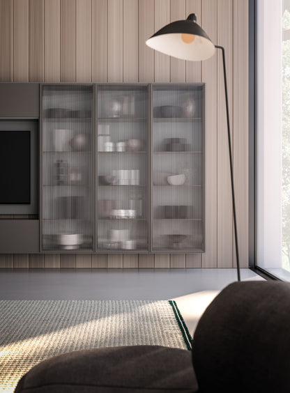 Suspended elegance with refined modularity. The Day 29-23 Bookcase Wall Unit by Orme Design blends sophisticated storage with a modern aesthetic. Its suspended shoulder bookcase in Basalto matt lacquer with Cannete glass doors and burnished metal frame offers both elegance and functionality, making it an ideal solution for showcasing books, décor, and media.