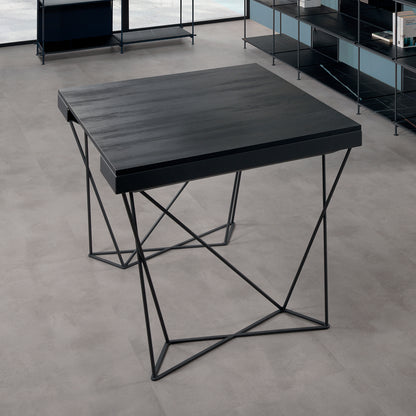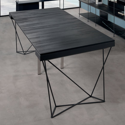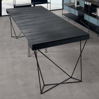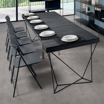 The extendable table console boasts a robust construction featuring a laminated steel structure and a solid 12 mm round base painted with a sable finish. The top surface, along with the five additional extensions supplied, is crafted from 18 mm thick ecological laminate, ensuring both durability and an environmentally conscious design.