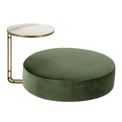 The table ingeniously extends from below the cylindrical pouffe, which is luxuriously covered in lush green velvet. This combination not only elevates the aesthetic appeal of the set but also ensures a comfortable and inviting seating experience. The Febe Pouf and Table set by Domingo Salotti stands as a testament to the fusion of artistic inspiration and practical design, making it a captivating addition to any interior space.