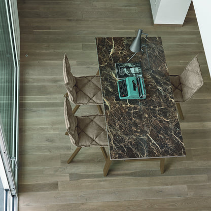 Constructed with aluminium and supported by sleek metal legs, the Giove 160 boasts versatility in its design. Its top surface offers two striking options: the choice between a porcelain stoneware top or a tempered glass top, both accompanied by side extensions that seamlessly match the colour of the table's surface. This blend of premium materials and thoughtful engineering not only guarantees durability but also ensures a harmonious integration of form and function, making the Giove 160 an irresistible centrepiece for your dining area. The price for the version with a ceramic top from £2110.00.