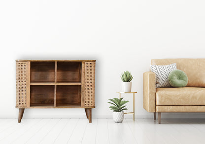 The Larissa open cabinet is sure to make a statement in your interior with its elegant simplicity and subtle uniqueness. Despite its captivating grain pattern and rattan design, this cabinet doesn't compromise on functionality. In fact, it boasts four small shelves and a spacious top surface, perfect for showcasing ornaments, flowers, or candles. Crafted entirely from 100% solid mango wood with a warm oak-ish finish, it also showcases Nordic-style legs for added charm.