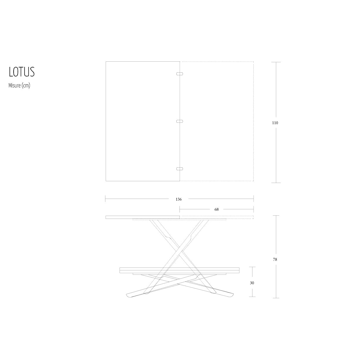 The double folding top, available in a selection of finishes including melamine, glass, concrete, or ceramic effect, adds an elegant touch to any space. Effortlessly manoeuvre with retractable wheels, ensuring ease of movement while maintaining its sleek aesthetic. Embrace functionality without compromise with the Lotus table an embodiment of transformative design and practicality in every sense.
