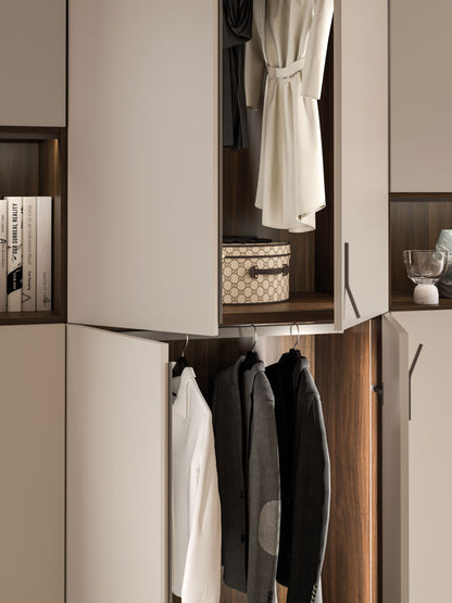 Inside, the wardrobe boasts a meticulously designed internal structure finished in Cotto. The warm, earthy hue of the Cotto finish brings a sense of natural luxury, while ensuring the interior remains practical and durable. Thoughtful shelving, hanging rails, and storage compartments maximise space for clothes and accessories, offering an organised and accessible solution for everyday use. The well-proportioned layout allows for customisable options to meet varying storage needs, ensuring that everything has its place within this beautifully designed wardrobe.