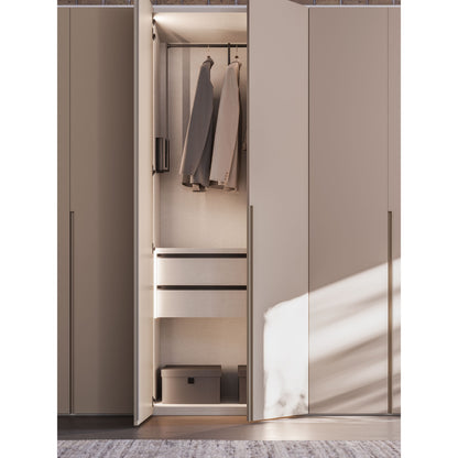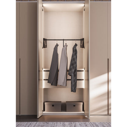 Inside, a soft Cotton finish creates a calm, neutral backdrop that enhances visibility and organisation. The minimalist interior layout maximises usable space for clothing, shoes, and accessories—combining style with everyday practicality.