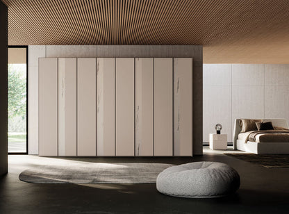 The doors are finished in Tortora melamine, a warm earthy tone that balances sophistication with durability. Adding subtle contrast, a vertical detail in Tenere marble melamine introduces a luxurious stone-effect accent, enriching the overall design with texture and elegance. Thoughtfully designed, this wardrobe combines style with functionality, delivering ample storage for clothes, shoes, and accessories.