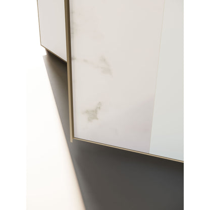 - Finish shown (images): Cotton interior; Bianco matt lacquer + Calacatta Gold printed glass doors; Palladio metal profiles
