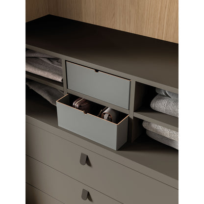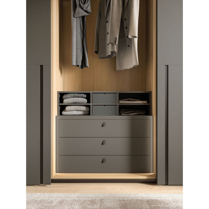 The internal structure is finished in Rovere, a refined oak-effect texture that adds warmth and natural character to the interior. Durable and inviting, it provides a practical base for everyday storage. Combined with Basalto matt lacquer doors, this wardrobe delivers timeless sophistication with versatile appeal, fitting effortlessly into both modern and transitional interiors.