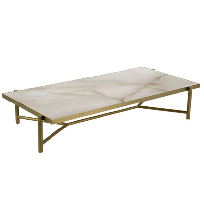 Introducing the Rea Coffee Table by Domingo Salotti, a stunning piece inspired by the Titaness, the mother of Zeus, from Greek mythology. This exceptional coffee table features a unique design with legs that support a rectangular top, elegantly upheld by a dynamic metal frame adorned with polished brass-finished legs. The deliberate placement of these legs creates a captivating, misaligned geometry, adding an element of intrigue to its aesthetic.