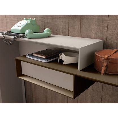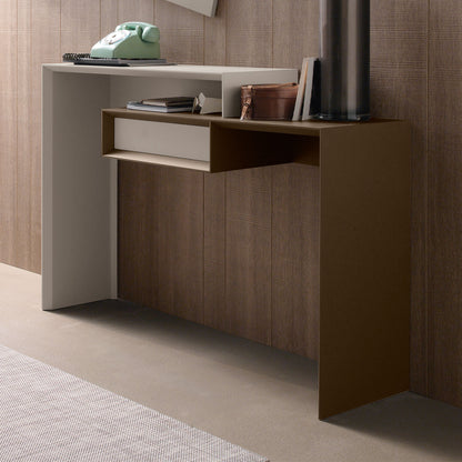 The shelves on two heights are completed with the drawer, which can be opened through the recess that frames it and which continues in the profiles of the entire console. The interlocking game is repeated in the Florence mirror, where an ideal frame is rotated.