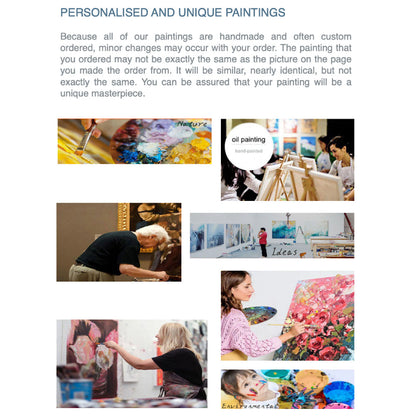 4. IS THE PAINTING I BOUGHT THE SAME AS THE PHOTO ON THE PAGE? Not exactly. Because all our paintings are handmade by our international artists, there might be minor changes that will make your order unique. Your painting will be nearly identical, but not exactly the same.