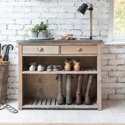 Beyond its rustic appeal and sturdy build, this bootroom unit excels in smart organisation. Equipped with two drawers, it goes beyond storing footwear by providing space for sorting posts, newspapers, and accessories with effortless elegance. The thoughtful design doesn't just prioritise storage but elevates the overall aesthetic of your space. With this unit, maintaining order becomes a stylish affair, offering a seamless blend of practicality and sophistication to your home's entryway or designated bootroom.