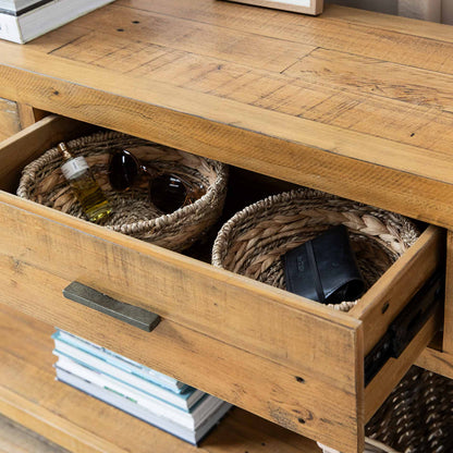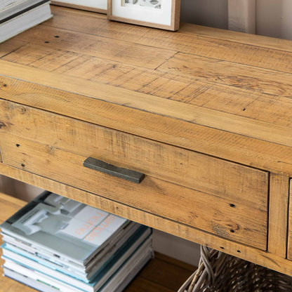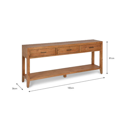 The Ashwell 3-Drawer Console Table stands as the perfect addition to elevate the aesthetic of any open hallway, effortlessly embodying elegance. Meticulously crafted from reclaimed pine and finished with clear wax, this console table not only enhances the allure of hallways but also proves to be a versatile piece suitable for dining rooms or living spaces. The use of reclaimed pine not only adds a touch of rustic charm but also aligns with sustainable and eco-friendly practices. The clear wax finish not only highlights the natural beauty of the wood but also provides protection, ensuring longevity and durability.