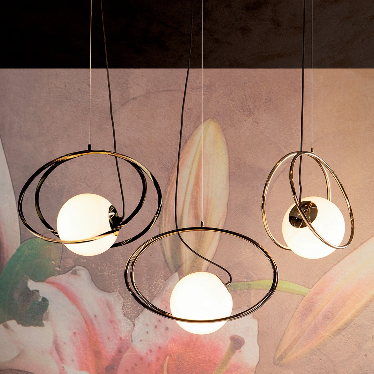 Step into a realm of sophistication with the Bijoux hanging lamp, a true gem that transcends mere illumination to become a statement of refined taste. Crafted with meticulous precision, this exquisite piece is a symphony of design and functionality. Two slender inclined ellipses elegantly cradle the ethereal lighting body - a sphere of milky white blown glass. From within this delicate orb emanates a soft, enchanting glow that gracefully transforms the ambience, creating a harmonious and suggestive effect that captivates the senses.