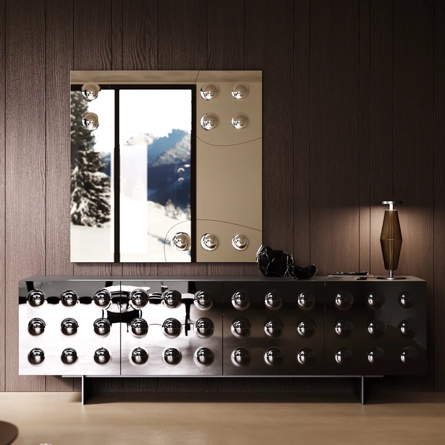 The Rock sideboard is a bold and innovative piece of furniture that combines cutting-edge design with practical functionality. Its sleek, glossy surface is punctuated by an array of polished chrome spheres, giving it a distinctive, sculptural look that stands out in any modern interior. The spherical accents are arranged in a geometric pattern, creating a dynamic interplay of light and reflection that adds depth and intrigue to the sideboard’s overall aesthetic.