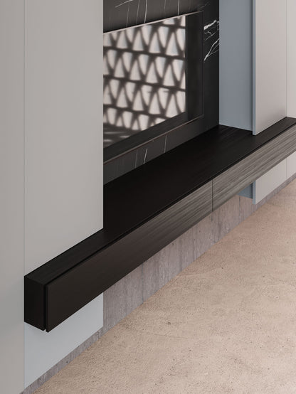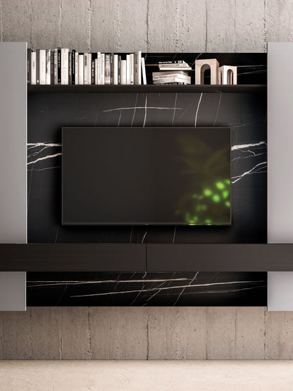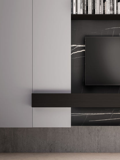 A suspended modular wall unit with Carbone, Piuma, and Tunisia marble finishes. -