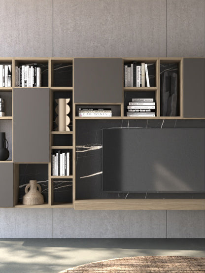 - Design details: Suspended structure with modular compartments, walnut and marble-effect finishes