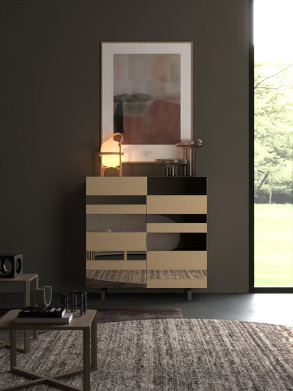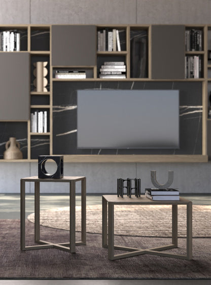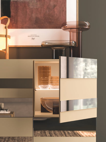 Pictured in Noce materic finish with Tufo matt lacquered doors and Tunisi marble melamine backs, the Day 33-23 exudes sophistication. Complementing elements include a console in walnut, a Vitro sideboard in Caramello matt lacquer with bronzed mirrors, and Agatea walnut coffee tables. Together, these create a harmonious ensemble that blends warmth, luxury, and functionality.