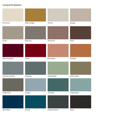 - Base: lacquered matt or gloss finish, wood veneer, and lacquered glass