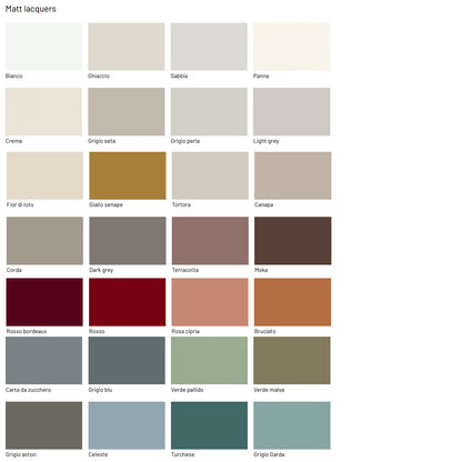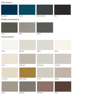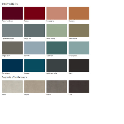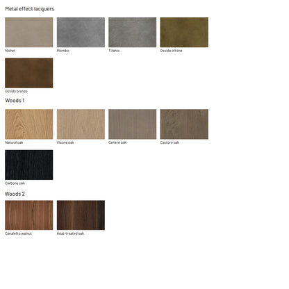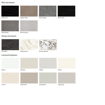 - Top: Available in textured finish, lacquered, wood veneer, lacquered glass and ceramic gres.