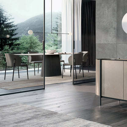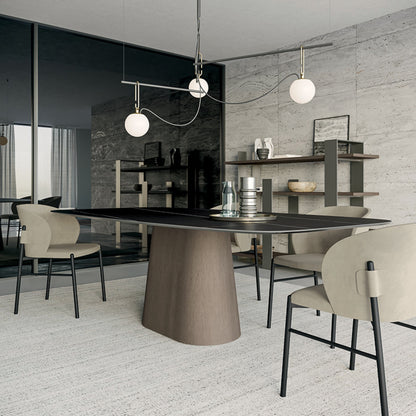 Available in various sizes, the Koniko table offers flexibility to fit different spaces, from intimate dining areas to expansive conference rooms. The slim, fixed top can be coordinated with the base in veneer or lacquered wood, with the option for a contrasting finish to create visual interest. Alternatively, the top can be crafted in stoneware or lacquered glass for a contemporary twist.