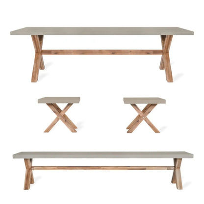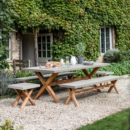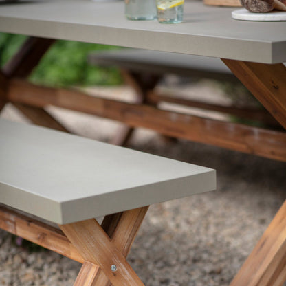 Immerse yourself in contemporary dining with the stylish Burford Table and matching Benches. The table, featuring a polystone top, seamlessly blends with acacia wood legs in a modern criss-cross design, creating a striking visual contrast. This generously proportioned set, available in two sizes, allows you to optimise your outdoor dining space, be it a charming patio, a stone courtyard, or a sleek decking area. The Burford Table and Benches set is a perfect union of form and function, adding a touch of sophistication to your outdoor dining experience.