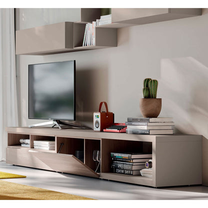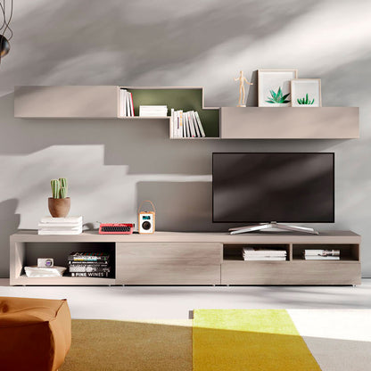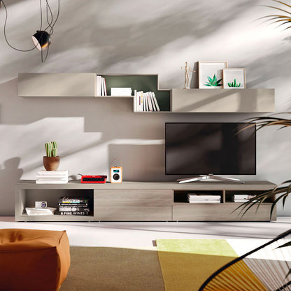 The Light Day 10 Modern TV Media Unit by Orme Design is part of the renowned Light Collection, crafted in Italy by Homes Orme. This modular unit showcases a balance of elegant design and adaptability, featuring push-pull base units, folding and vasistas wall units, a snack bench, and open wall modules. Displayed in Oxidised wood, Tortora, and Salvia melamines, the Day 10 composition highlights the collection’s versatility and refined aesthetic.