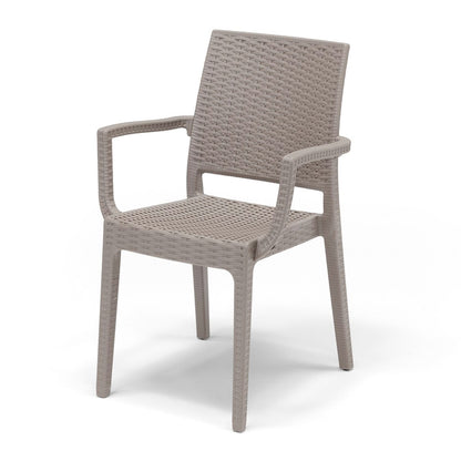 Indulge in luxury with the Saturno 4-Seater Dining Set by Areta. This elegant set features a sophisticated anthracite grey and timeless taupe design. Its ergonomic frame combines comfort, durability, and ease of handling. The lightweight construction is made of gas air molding technopolymer polypropylene, reinforced with glass fibre. This low-maintenance set can be confidently left outdoors, offering years of use with minimal upkeep.