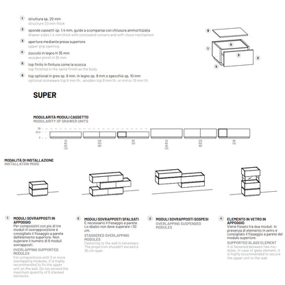 Backs: Made of wood particle-board panels, 20 mm th., melamine laminated. - Drawers: Sides 14 mm th. and bottoms 8 mm th. made of wood particle-board panels with leather-effect melamine finish. Easy-slide concealed metal runners, 30 kg dynamic load capacity. “Blumotion” soft closing mechanism with height adjustment system. A standard built-in stabilizer is provided for drawers with a width equal or larger than 90 cm.