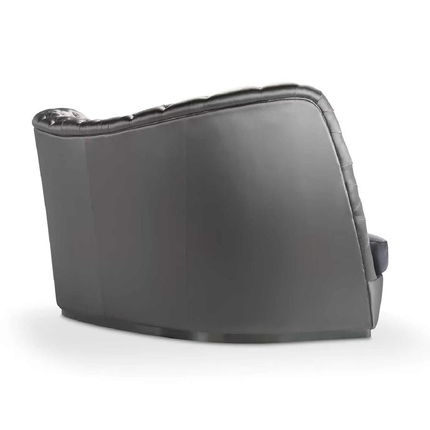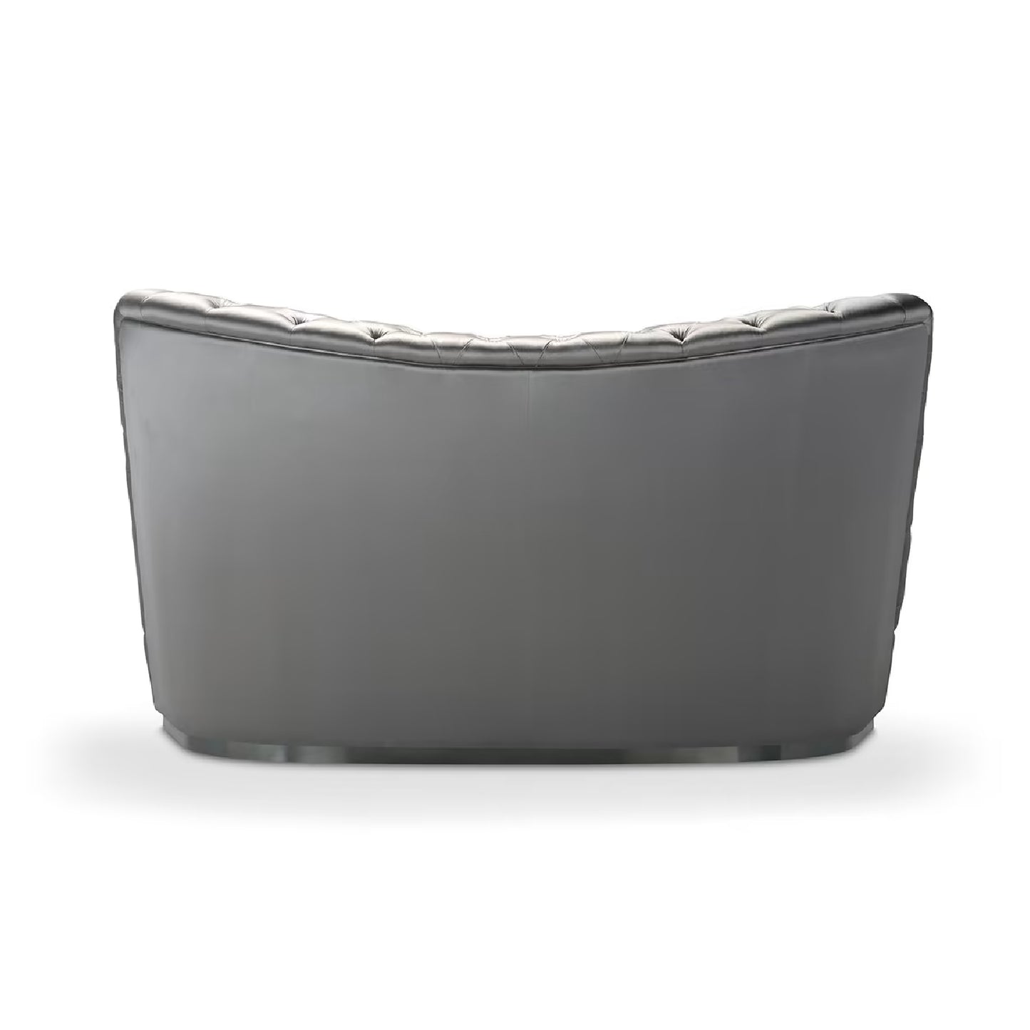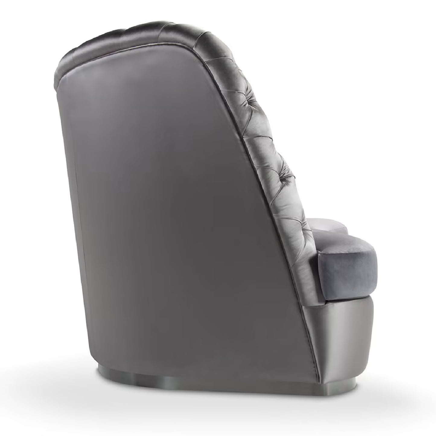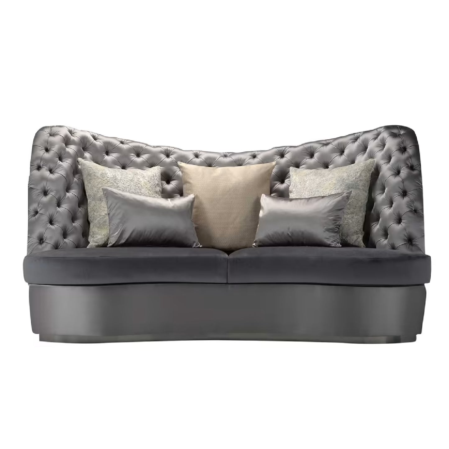 The sinuous plinth base, crafted from laminate with a gunmetal finish, adds a touch of modernity to the overall aesthetic. The richness of detail is highlighted by a captivating capitonne quilted pattern that adorns the backrest, enhancing the visual appeal of the sofa. In terms of material selection, the Thalia Sofa strikes a perfect balance between opulence and subtlety. The seat is upholstered in a sumptuous dark grey velvet, offering a luxurious and inviting feel.