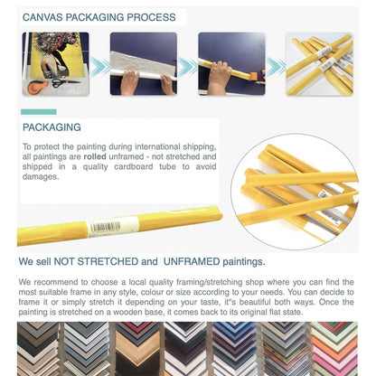 3. WILL THE PAINTING BE FRAMED? No, it will not be framed. To protect your painting better during international shipping, all paintings are rolled( Unframed/ Not stretched) packed and shipped in a quality cardboard tube to avoid damages. It's 100% safe and the painting will come back to its original flat state once you stretch it on a wooden frame.