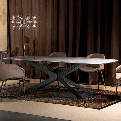 The Blade Dining Table by Tonin Casa stands as a testament to exquisite design and sophisticated craftsmanship. Its single central base, meticulously crafted from painting steel, serves as the focal point of this elegant piece. The table's minimalist yet impactful aesthetic is further accentuated by the option of a wooden cover that gracefully unfolds towards the top. This subtle touch not only adds a layer of versatility to the design but also imbues the table with an air of lightness.