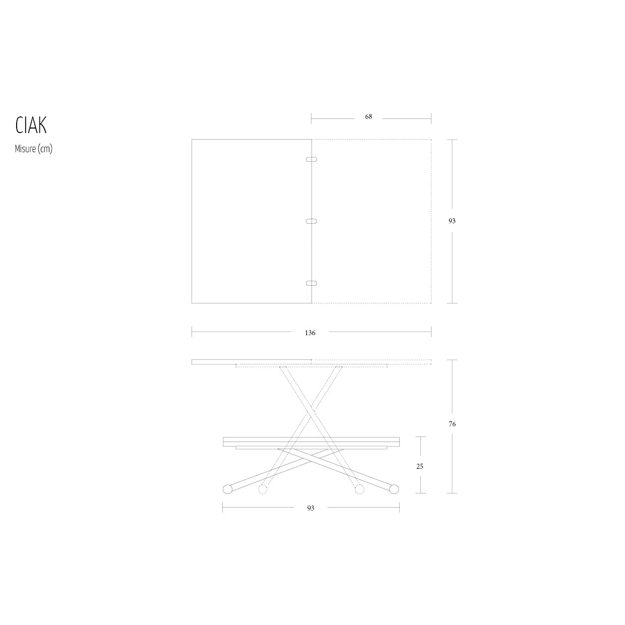 Crafted with a sturdy metal base and an innovative gas mechanism, Ciak offers unparalleled adjustability, allowing precise height alterations from a minimal 25 centimetres to a generous 76 centimetres. Its double-folding top, available in melamine, glass, mortar-effect, or ceramic finishes, not only enhances its aesthetic appeal but also amplifies its adaptability to suit varying preferences.