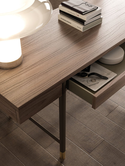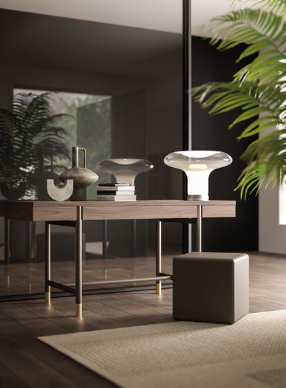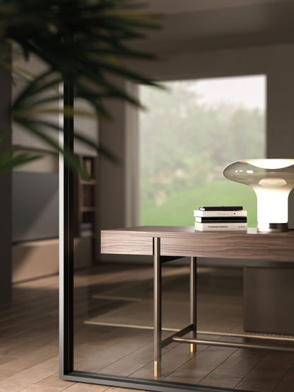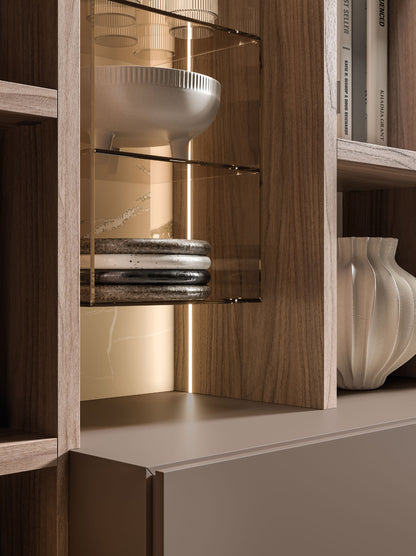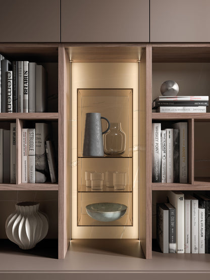 The shoulder bookcase is finished in warm Noce materic with backs in Tenere marble melamine and doors in Terra matt lacquer. Vidro elements in bronzed glass, enhanced with optional vertical lighting, add depth and refinement. A matching Abram console in Noce with burnished metal accents and Cumino metallic lacquer surfaces, together with the Quadrato pouf in eco-leather, complete the ensemble with timeless sophistication.