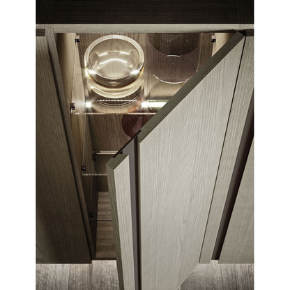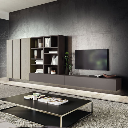 The Logico collection offers extensive customisation, with options including sliding glass doors, hinged doors, drawers, flap cupboards, and open shelving. The showcased Day 27 composition, priced at £4229.30, features shelves, three tall hinged doors, and two large drawers, finished in an elegant combination of Clay matt lacquer and Oxidised Ash with push-pull Virgo handles. This handcrafted unit delivers Italian quality and a harmonious balance of display and storage.