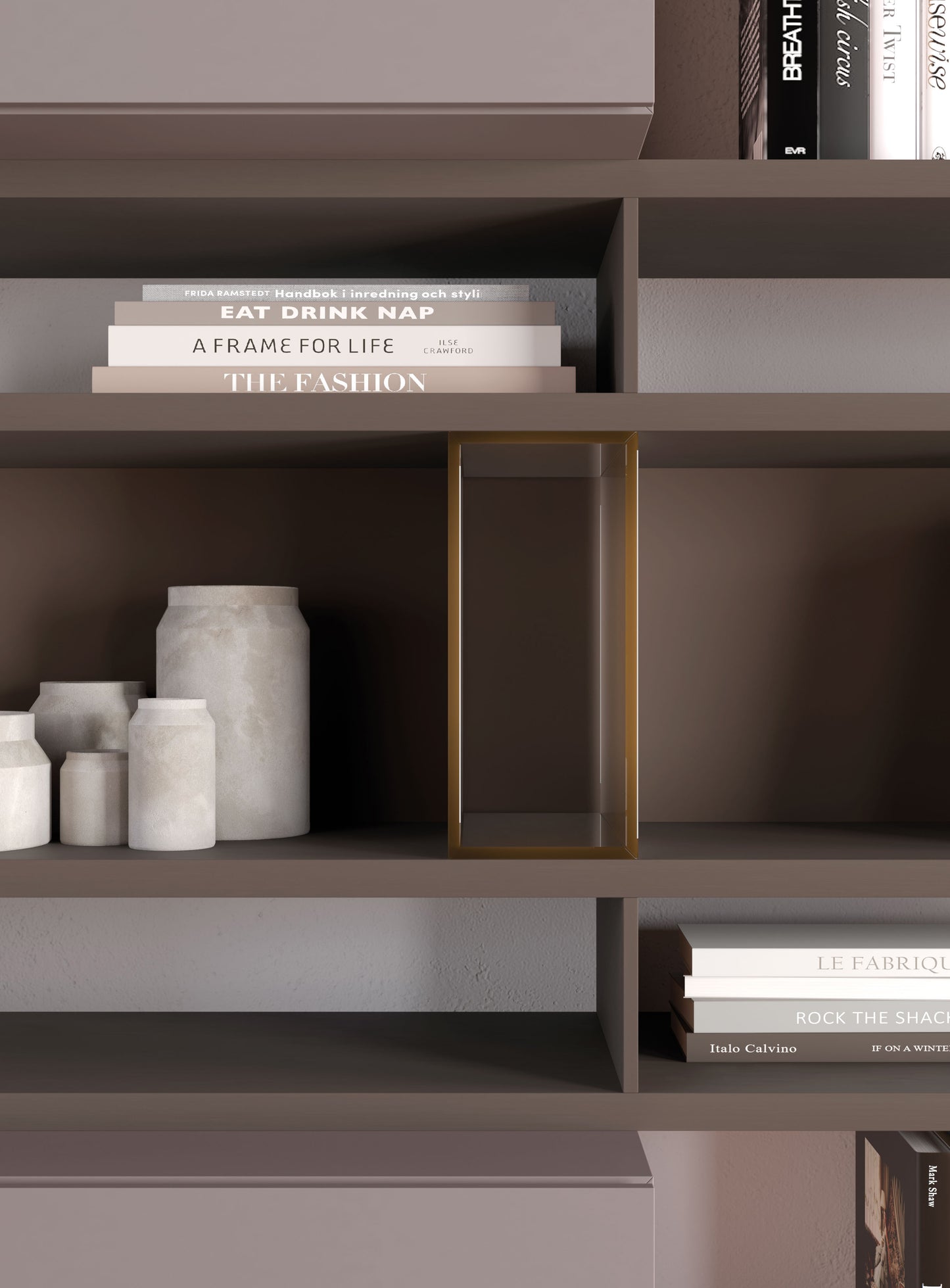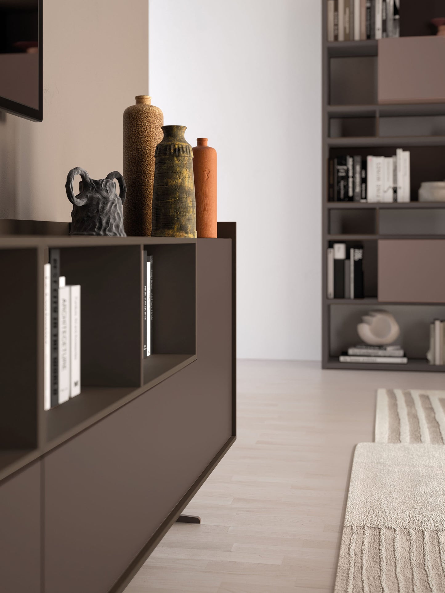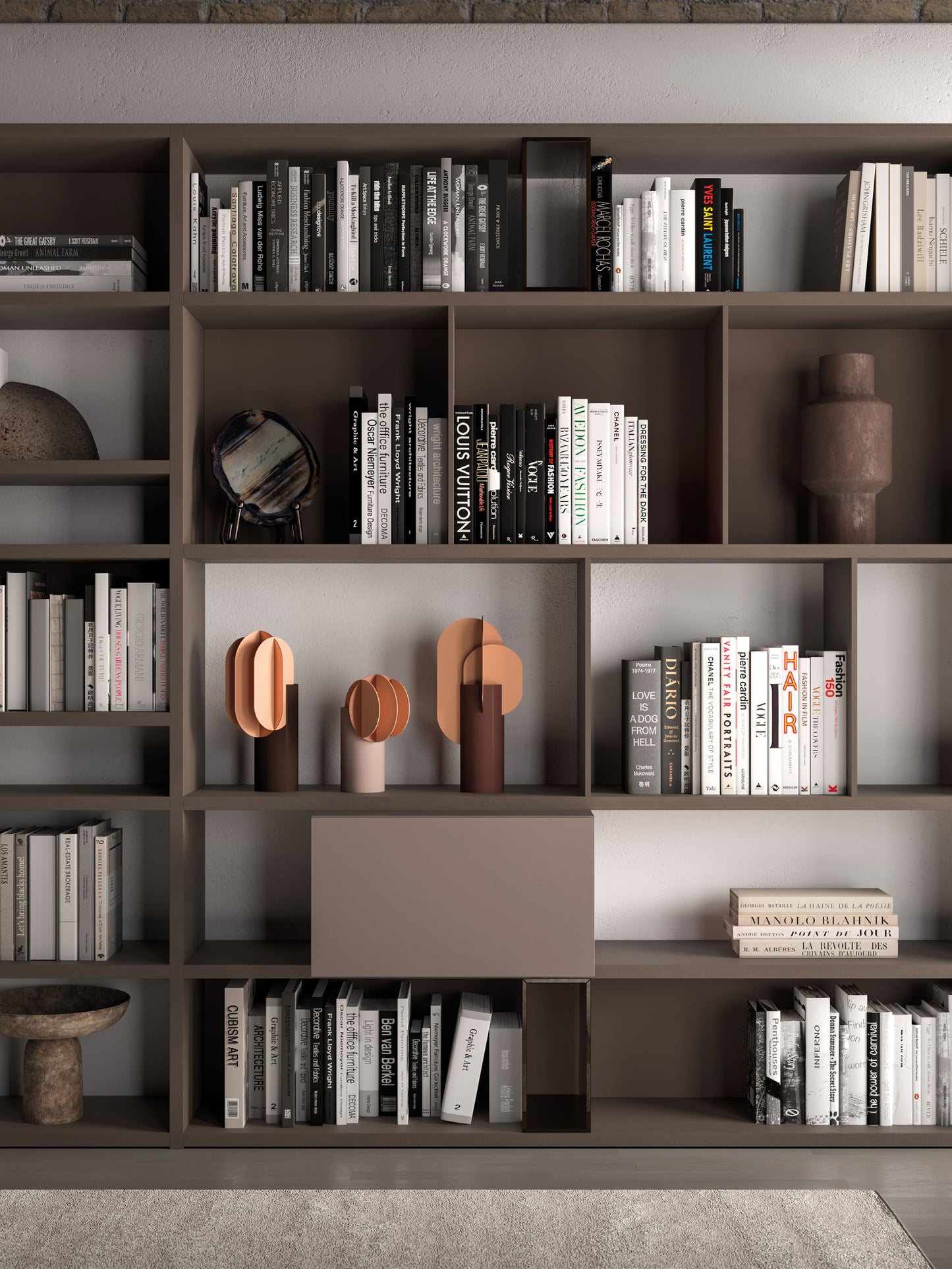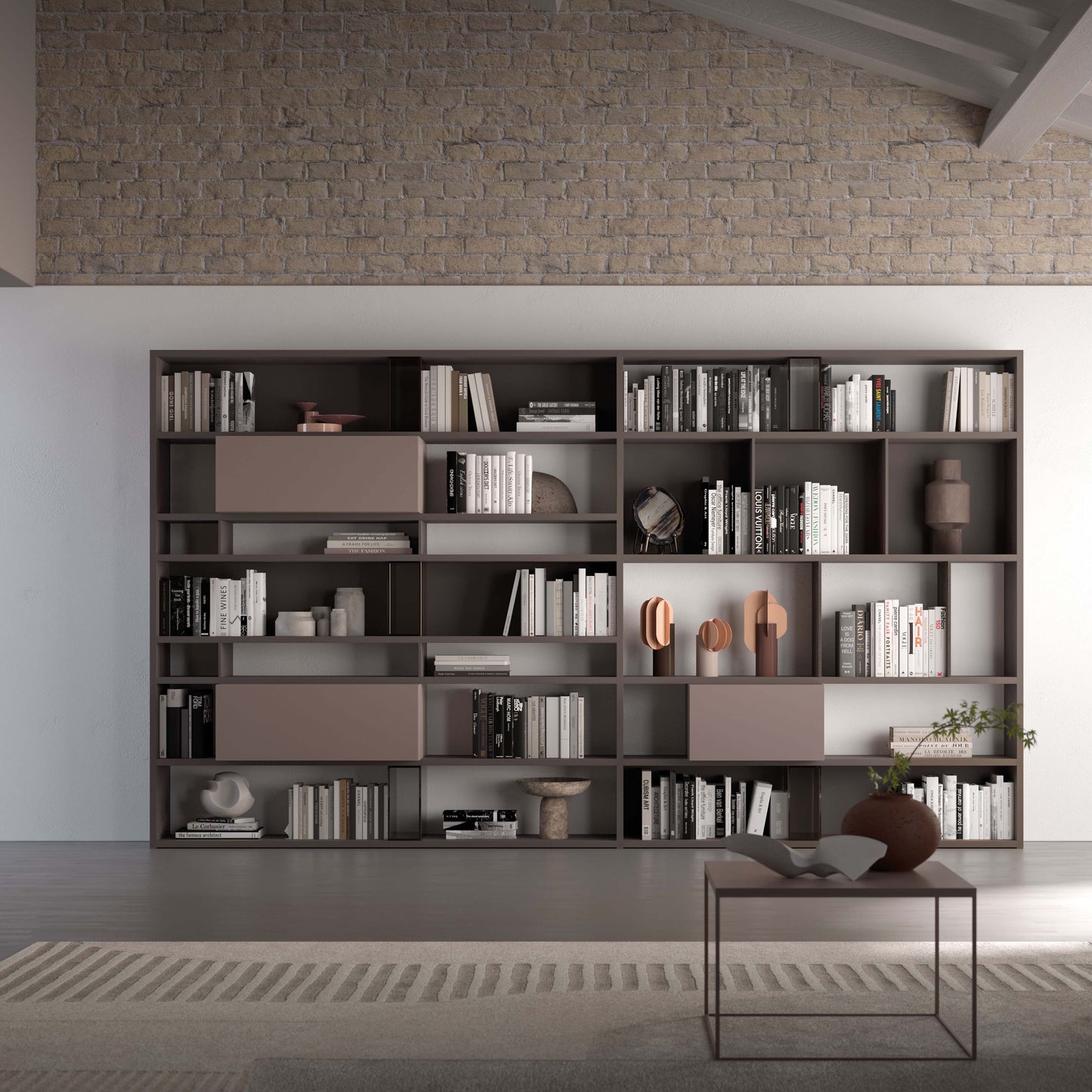 - Finish shown (images): Bookcase in Bronzo melamine, Compongo wall units in Ortensia lacquer, bronzed glass dividers