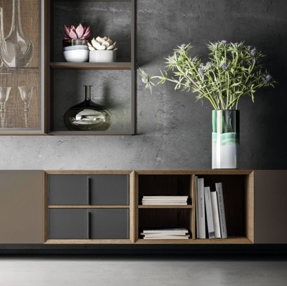 The Modulo System gives you complete freedom to add or remove cabinets, drawers, and shelving to suit your space. Shown here in Terra matt lacquer, Frassino Cuoio, and Textil finish glass, Day-6 delivers a minimal chic aesthetic through a smart interplay of profiles, recesses, and compartments—creating an airy architectural presence that elevates any living room.