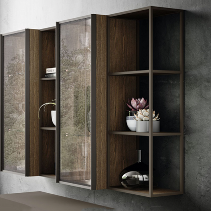 - Elements: Wall-mounted base units with drawers, wall-mounted glass-door cabinets, open shelving unit