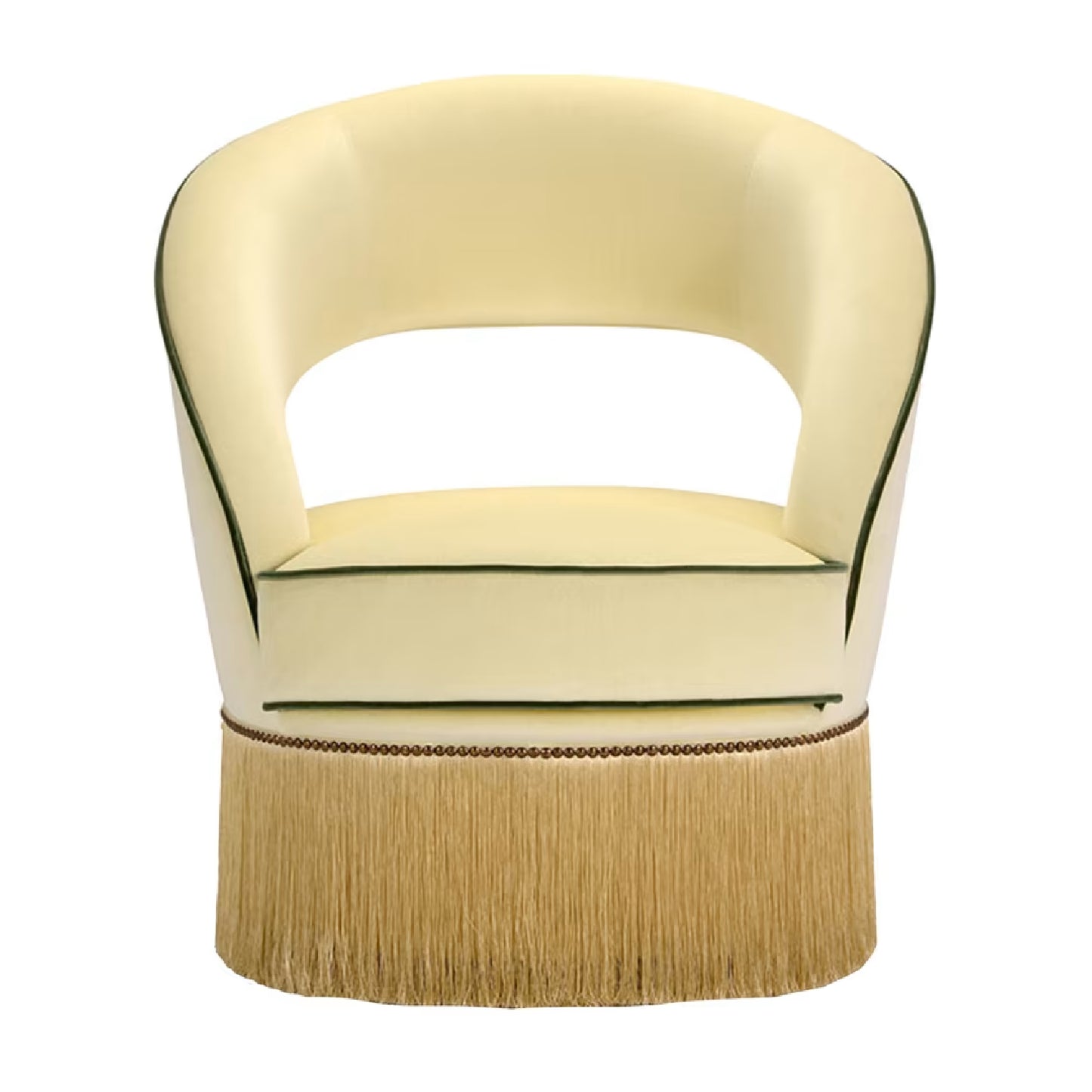 The Dione Armchair by Domingo Salotti stands as a splendid enhancement to classic decor, drawing inspiration from the mythological figure of Dione, the mother of Aphrodite, as described in Homer's "Iliad." The armchair's design showcases an elegant circular seat supported by a base adorned with delicate fabric fringes. The open backrest, crafted from a sloping and deeply curved element, prioritises not just aesthetic appeal but also an unparalleled level of comfort.