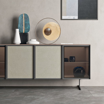 This model features a Terra matt lacquered structure combined with Cement Siena panels and Bronzed glass doors, finished with a burnished frame and Kako base. Customers can personalise the piece with four distinct metal base designs—Tiglio, Kako, Erica, and Dalia—and an extensive range of melamine, lacquer, veneer, marble, and glass finishes. Handmade in Italy, the Glass 02 combines refined aesthetics with practical storage.