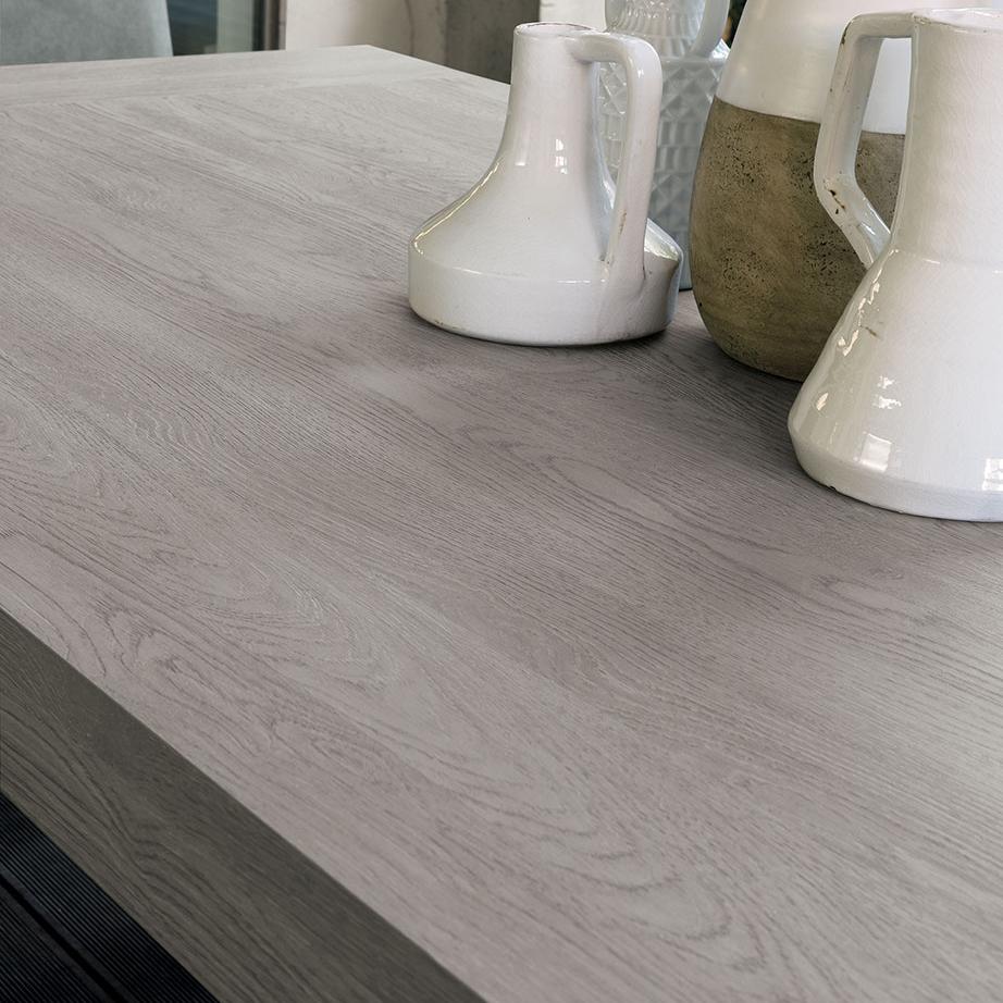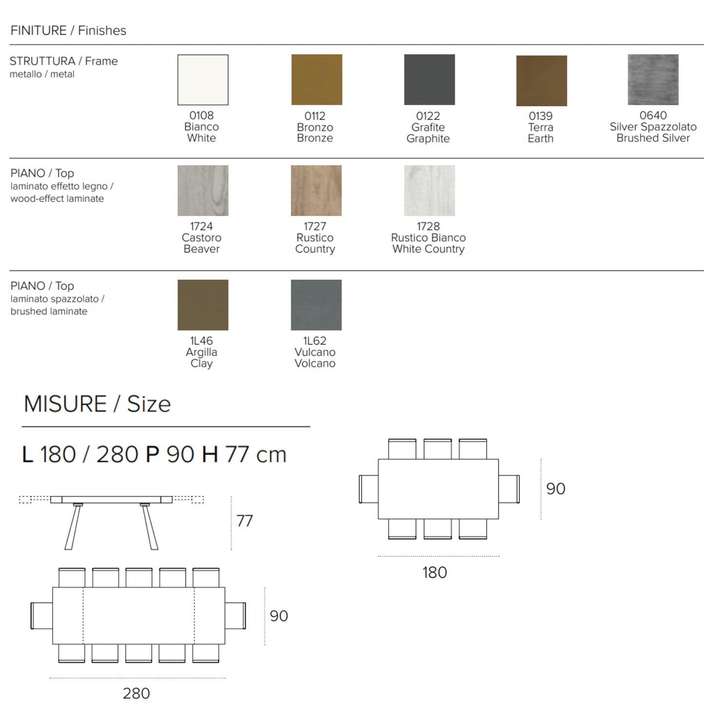 In picture 1: Top: Country wood laminate; Base: Brown metal. Extending @ 180 (280) x 90 x H 75 cm.In picture 2: Top: Beaver wood laminate; Base: Graphite metal. Extending @ 180 (280) x 90 x H 75 cm.