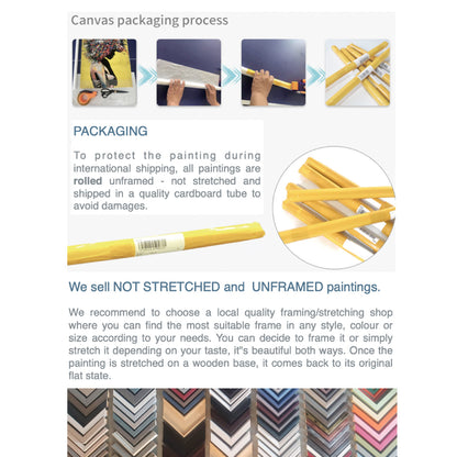 3. WILL THE PAINTING BE FRAMED? No, it will not be framed. To protect your painting better during international shipping, all paintings are rolled( Unframed/ Not stretched) packed and shipped in a quality cardboard tube to avoid damages. It's 100% safe and the painting will come back to its original flat state once you stretch it on a wooden frame.
