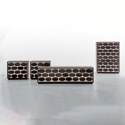 Replicating the shape and texture of honeycomb, Its simplicity and exquisite choice of materials such as solid wood on top of a mirror panel is a signature feature of Tonin Casa: always aiming for perfection and excellence.